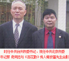 梅安富先生軍人出身(曾經(jīng)在中國馬蘭核試驗(yàn)基地工作十多年,為核武器發(fā)展做出了卓越貢獻(xiàn)、被評(píng)為八級(jí)軍殘)、高級(jí)經(jīng)濟(jì)師、中共優(yōu)秀黨員、天臺(tái)山人氏。現(xiàn)任中共鄭州臺(tái)州商會(huì)支部委員會(huì)書記、常務(wù)副會(huì)長兼秘書長、河南省保健品協(xié)會(huì)副會(huì)長、全國政協(xié)副主席、中共中央委員、中國殘聯(lián)主席鄧樸方先生與鄭州臺(tái)州商會(huì)支部書記兼秘書長、《百花散》傳人梅安富先生親切交談鄭州市腫瘤康復(fù)協(xié)會(huì)名譽(yù)會(huì)長。2005年5月,作為臺(tái)州古代中醫(yī)秘方梅氏《百花散》
